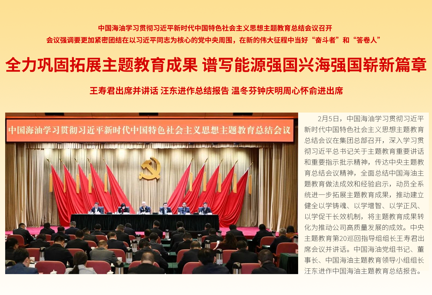凝心聚力促发展,驰而不息抓落实。让我们更加紧密地团结在以习近平同志为核心的党中央周围,以高度政治责任感和饱满的热情、昂扬的斗志、务实的作风,扎实开展好主题教育,从习近平新时代中国特色社会主义思想中汲取奋发进取的智慧和力量,向着加快建设世界一流企业宏伟目标不懈奋斗,为全面建设社会主义现代化强国贡献海油力量!