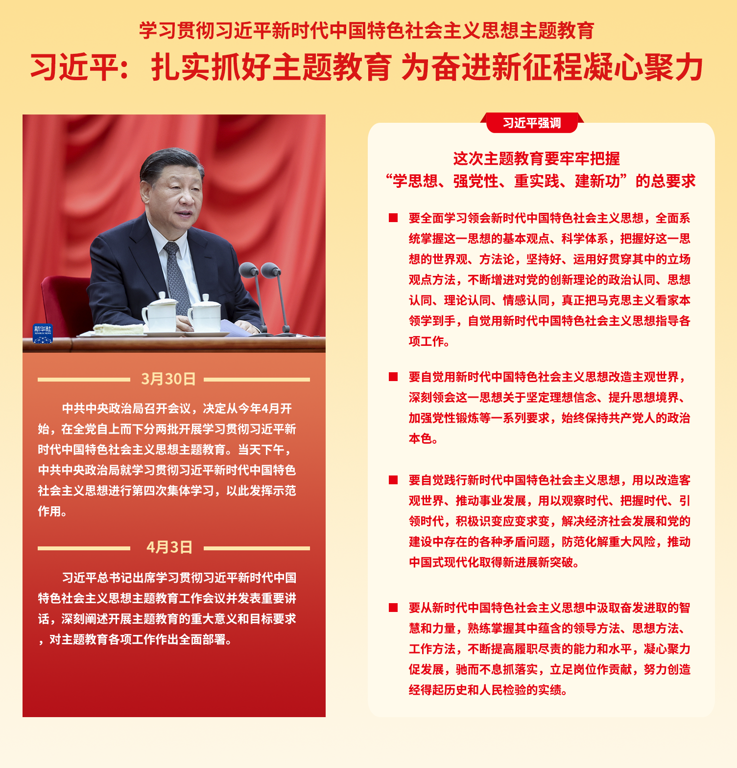 要切实把主题教育谋划好、组织好、落实好,确保取得扎实成效。要高度重视、精心组织,把开展主题教育作为重大政治任务抓紧抓好,确保主题教育扎实有序推进。要围绕中心,求真务实,把开展主题教育同指导实践、解决问题结合起来,同生产经营、党建工作结合起来,同深化改革、创新发展结合起来。要注重宣传引导,营造良好氛围,建立巩固深化主题教育成果的长效机制,健全学习贯彻党的创新理论的制度机制,确保主题教育常态长效、持续用力、久久为功。
