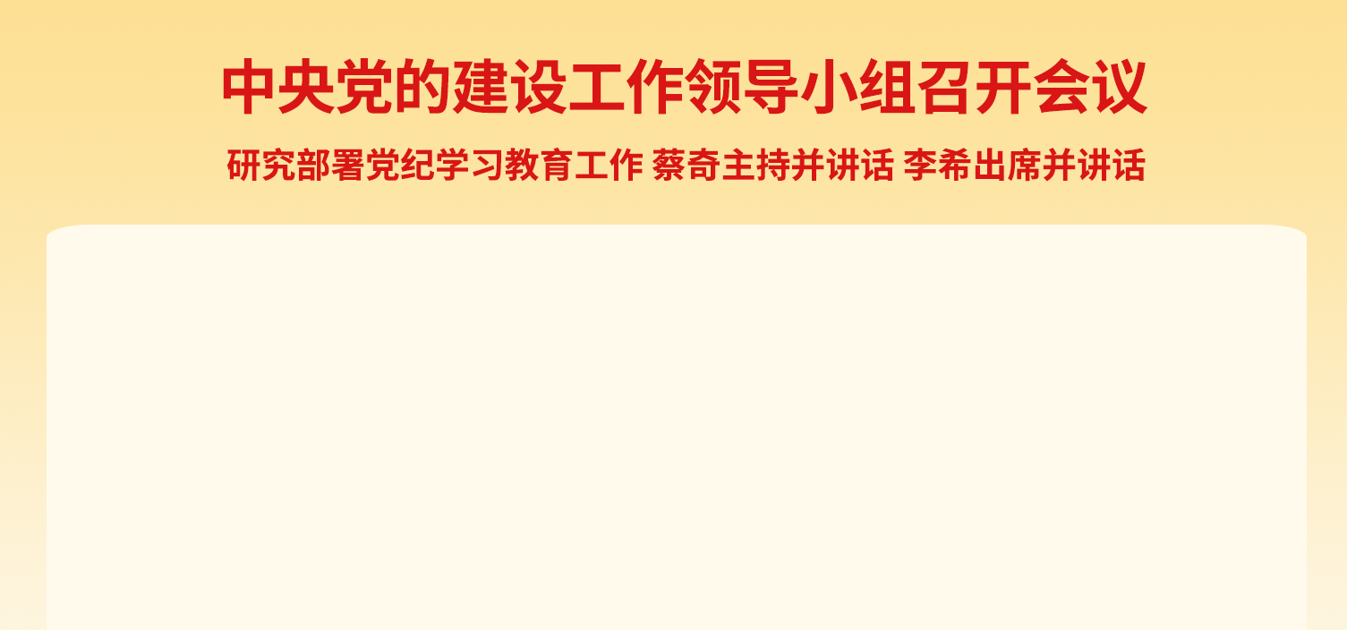 新华社北京4月3日电 中央党的建设工作领导小组3日召开会议,学习贯彻习近平总书记关于党纪学习教育的重要讲话和重要指示精神,听取党纪学习教育准备工作情况汇报,研究部署党纪学习教育工作。中共中央政治局常委、中央党的建设工作领导小组组长蔡奇主持会议并讲话,中共中央政治局常委、中央党的建设工作领导小组副组长李希出席会议并讲话
